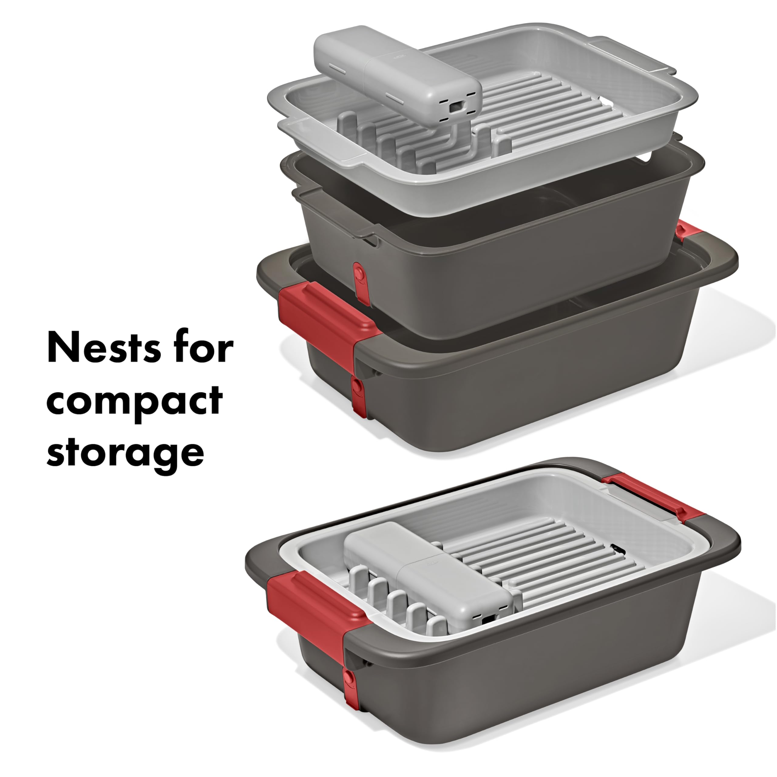 - Bins and utensil holder nest for compact storage when it’s time to hit the road, plus sponges and brushes rest in wash bin handles when not in use, and handles lock together to transport as one unit